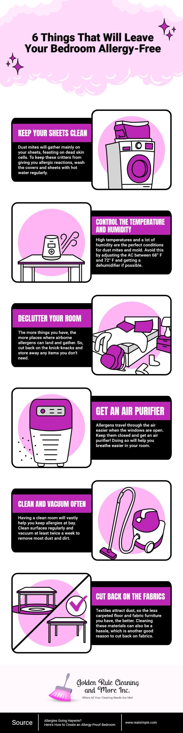 Stop struggling with allergies in your home! Let Golden Rule Cleaning And More clean your bedroom so you don’t have to deal with allergens. Book now.